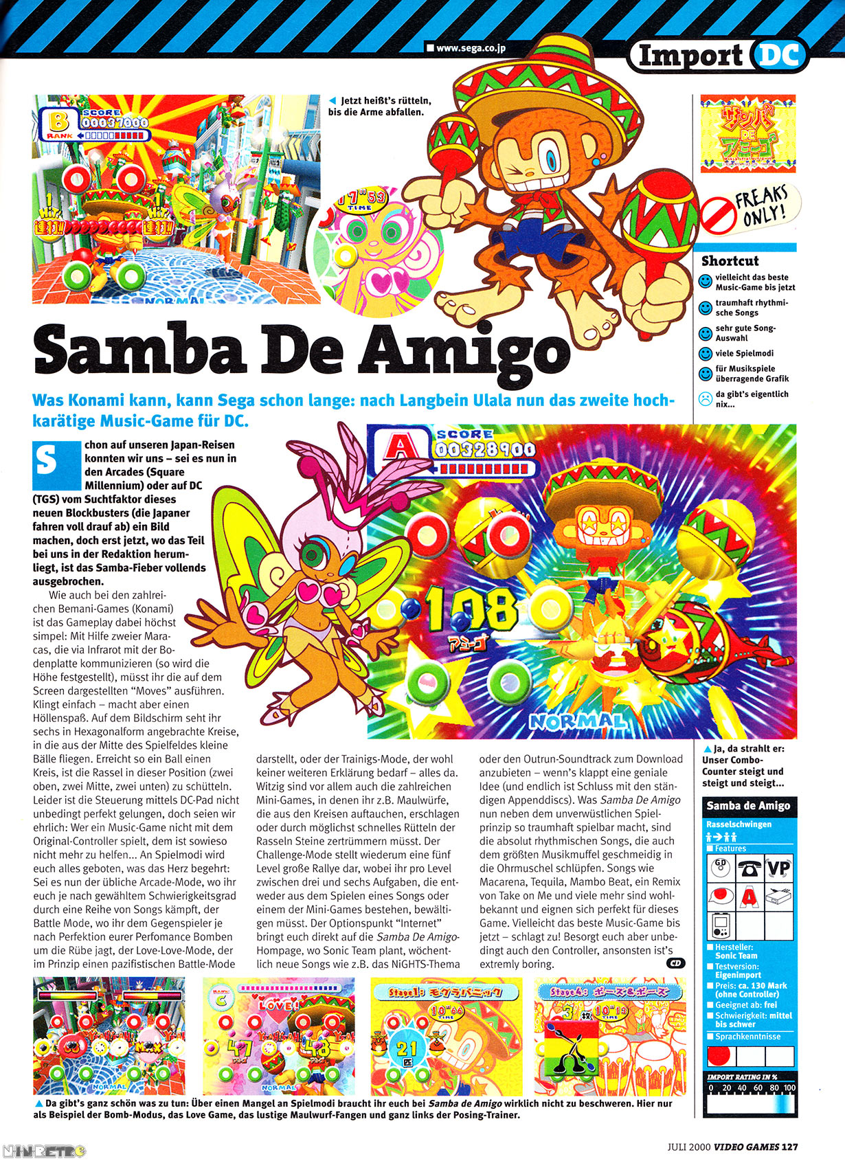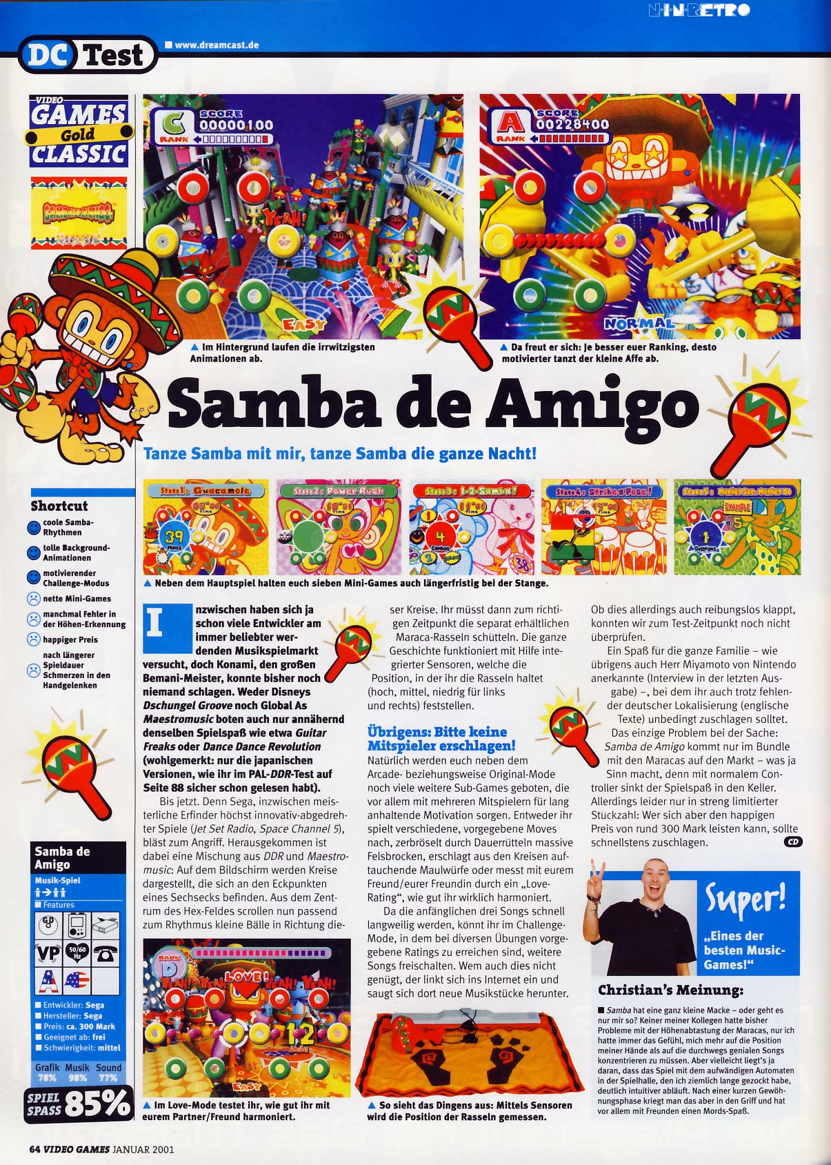 "Samba de Amigo", developed by the world-renowned Sonic Team, adds Latin flavor to Sega Dreamcast. With a crazy cast of characters, mucho music and a new Maracas Controller. "Samba de Amigo" will bring you a fiesta of fun!