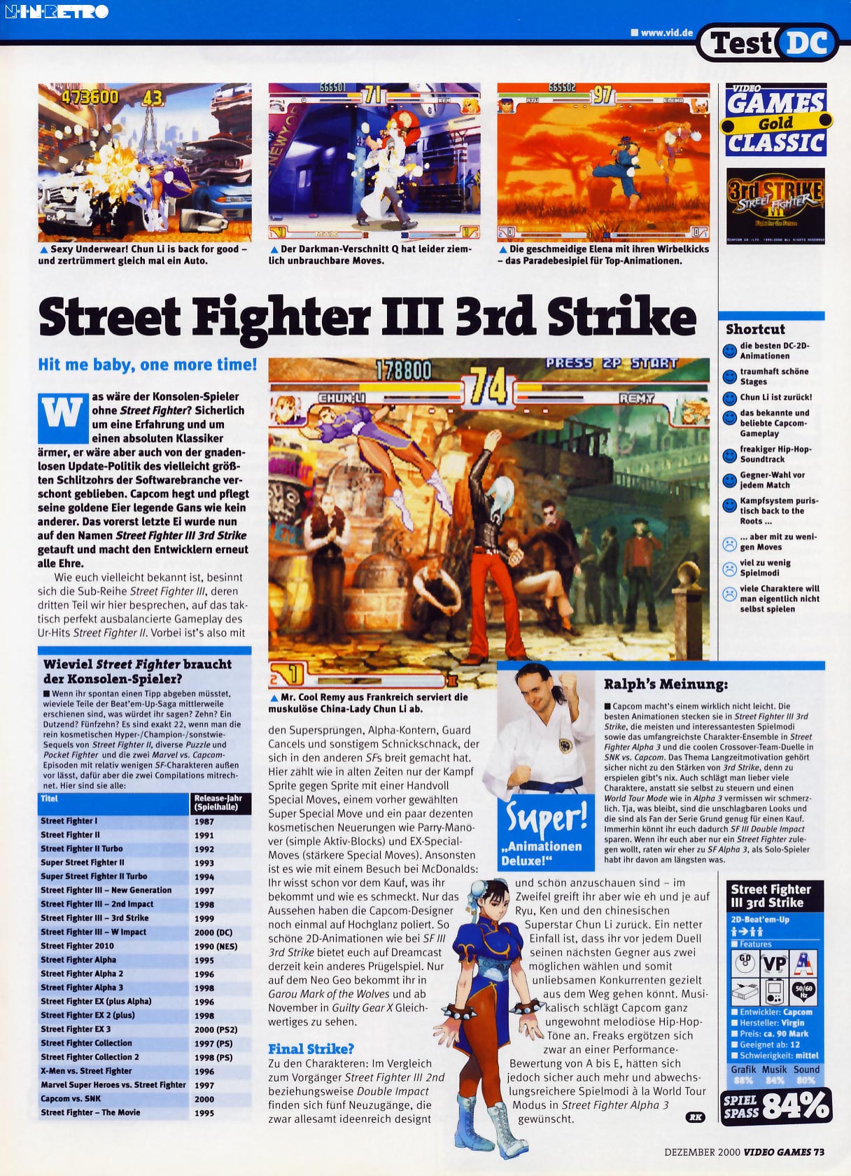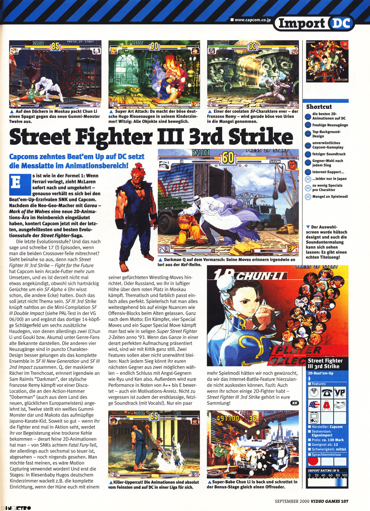 Street Fighter 3 ist wirklich gut. In meinen Augen kommt es wegen der Effekthascherei nicht an den 1995 erschienenen SNES-Ableger ran. Es hat zwar die schöneren Animationen, aber ist nicht so stimmig. Für DC-Besitzer ist der Titel auf jeden Fall lohnenswert.