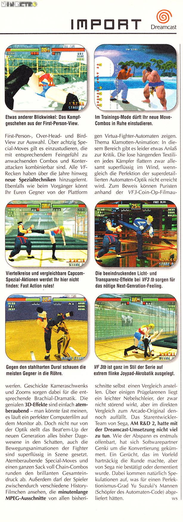 Vom weltbekannten Entwicklerteam AM2 und SEGA kommt jetzt brandheiß Virtua Fighter 3tb. Spannung und Nervenkitzel des genialen Spielautomaten wurden für Dreamcast originalgetreu umgesetzt - und als Dreingabe gibt es einen völlig neuen Team Battle Modus. Stelle Dein Kampfgeschick gegen den Computer unter Beweis oder fordere einen Freund heraus. Wähle aus zwölf Charakteren, von denen jeder hunderte von verschiedene Moves und seinen ganz eigenen Kampfstil hat.