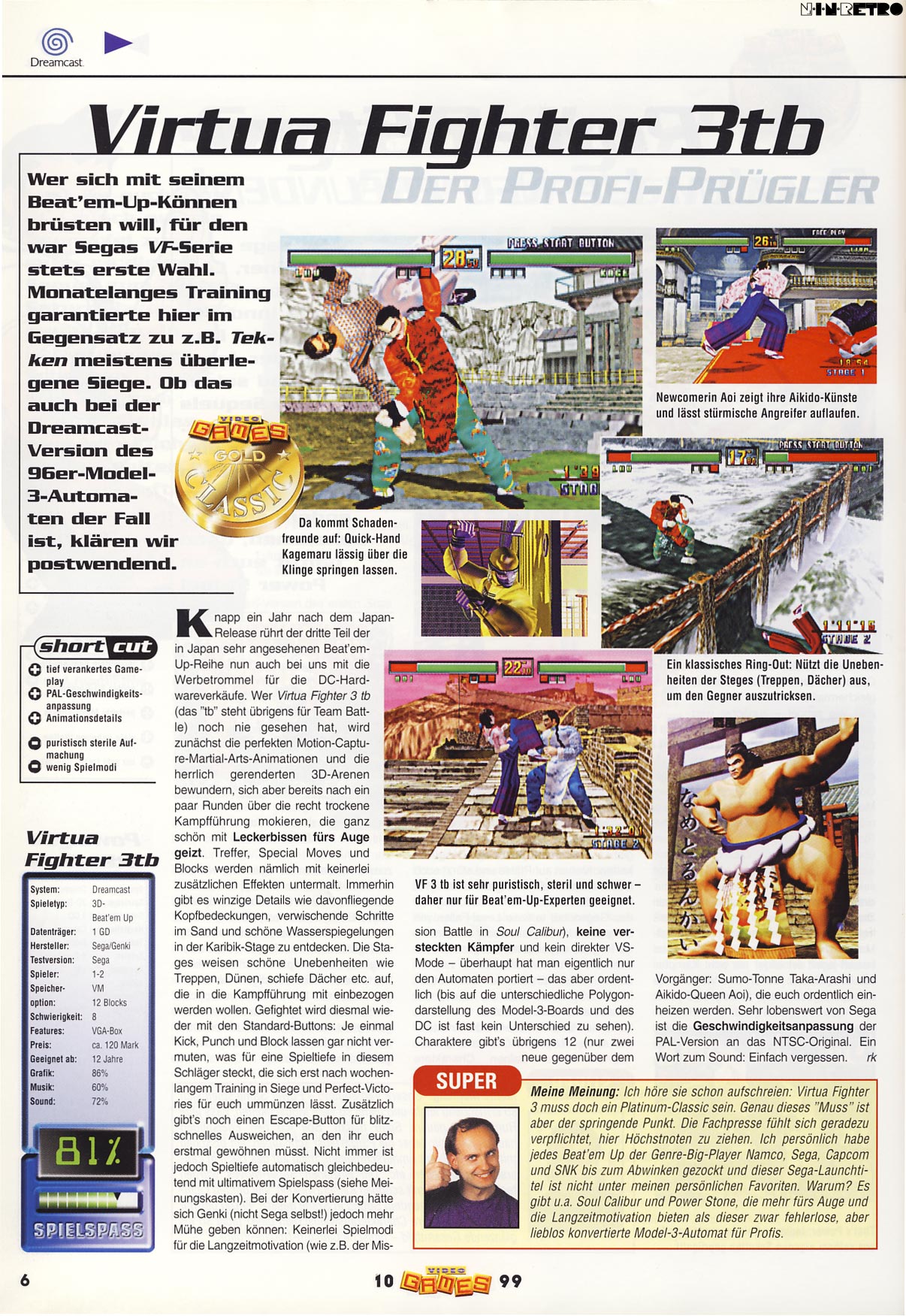 The world renowned AM2 and Sega bring you Virtua Fighter 3tb. All the thrills & excitement of the arcade sensation have been faithfully recreated on Dreamcast, with the addition of an all new team battle mode. Test your fighting skills against the computer or challenge a friend using one of the twelve characters each with hundreds of different moves and their own unique style of fighting. Virtua Fighter 3tb, the fighter's choice.