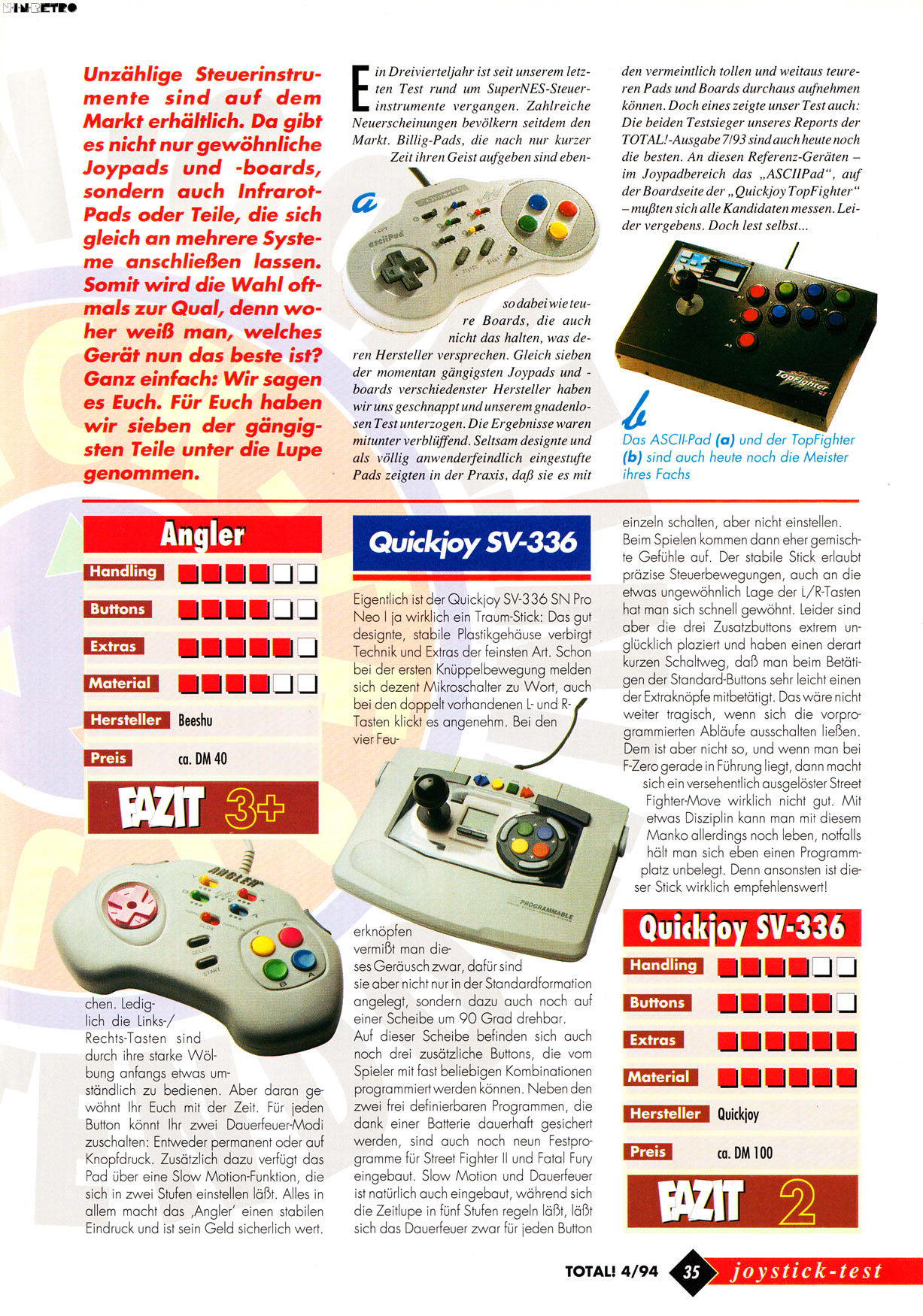 Total und Gamers hatten zu der Zeit ja praktisch die gleichen Redakteure. Insofern ist es nun nicht verwunderlich, das auch die Total! solch einen Gamepadtest hat und genauso wie die Gamers (die das 6-Button Pad von Sega mit einer 4- bewerteten ) recht streng zur Sache gingen. Gerade, weil eigentlich nie die wirklich billigen Pads getestet wurden, sondern eher schon das, was man Qualitätsware von bekannten Herstellern nennen kann.